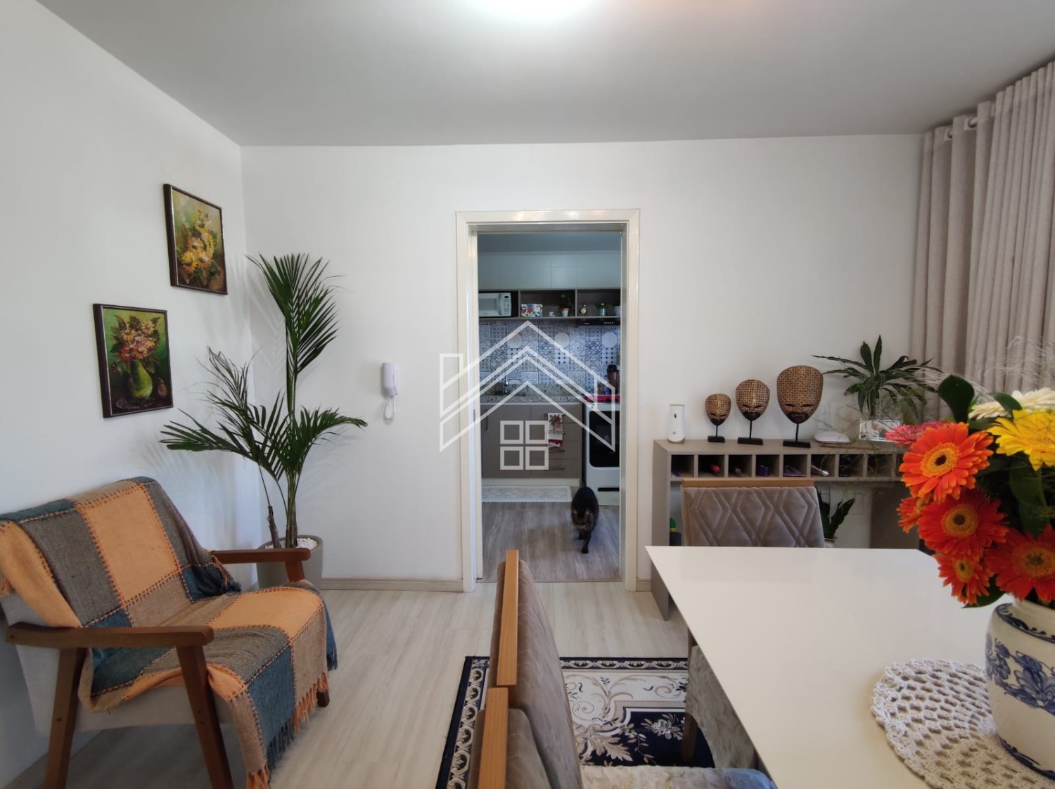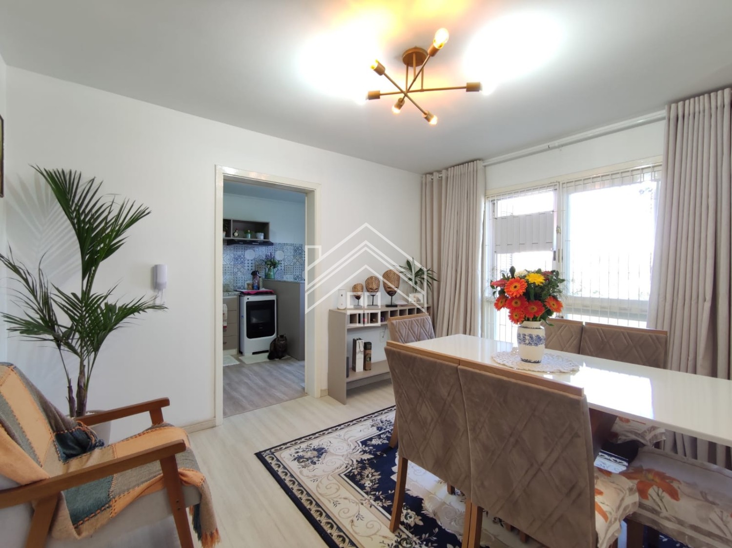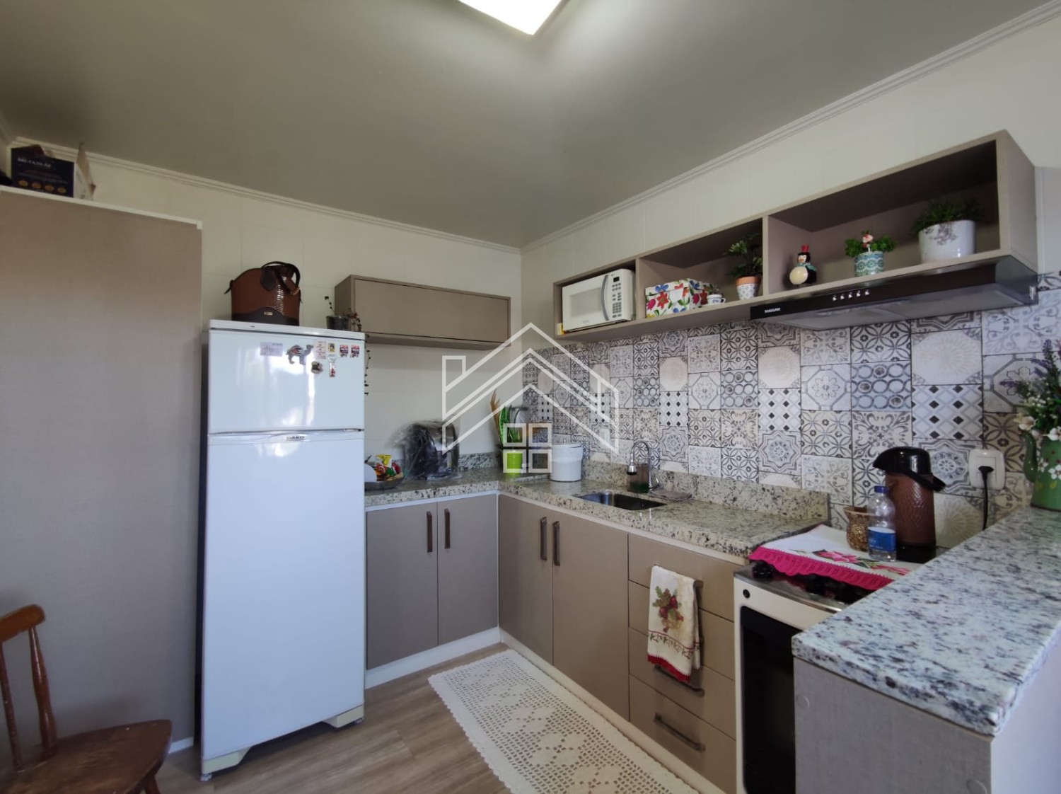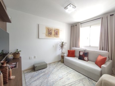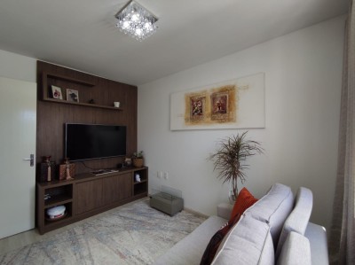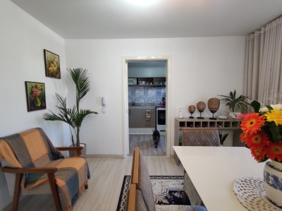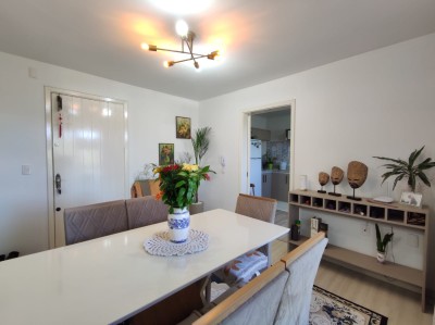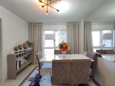 Descrição › Apartamento de 02 dormitórios, sala de estar e jantar, cozinha, área de serviço, 01 banheiro e uma vaga de garagem.