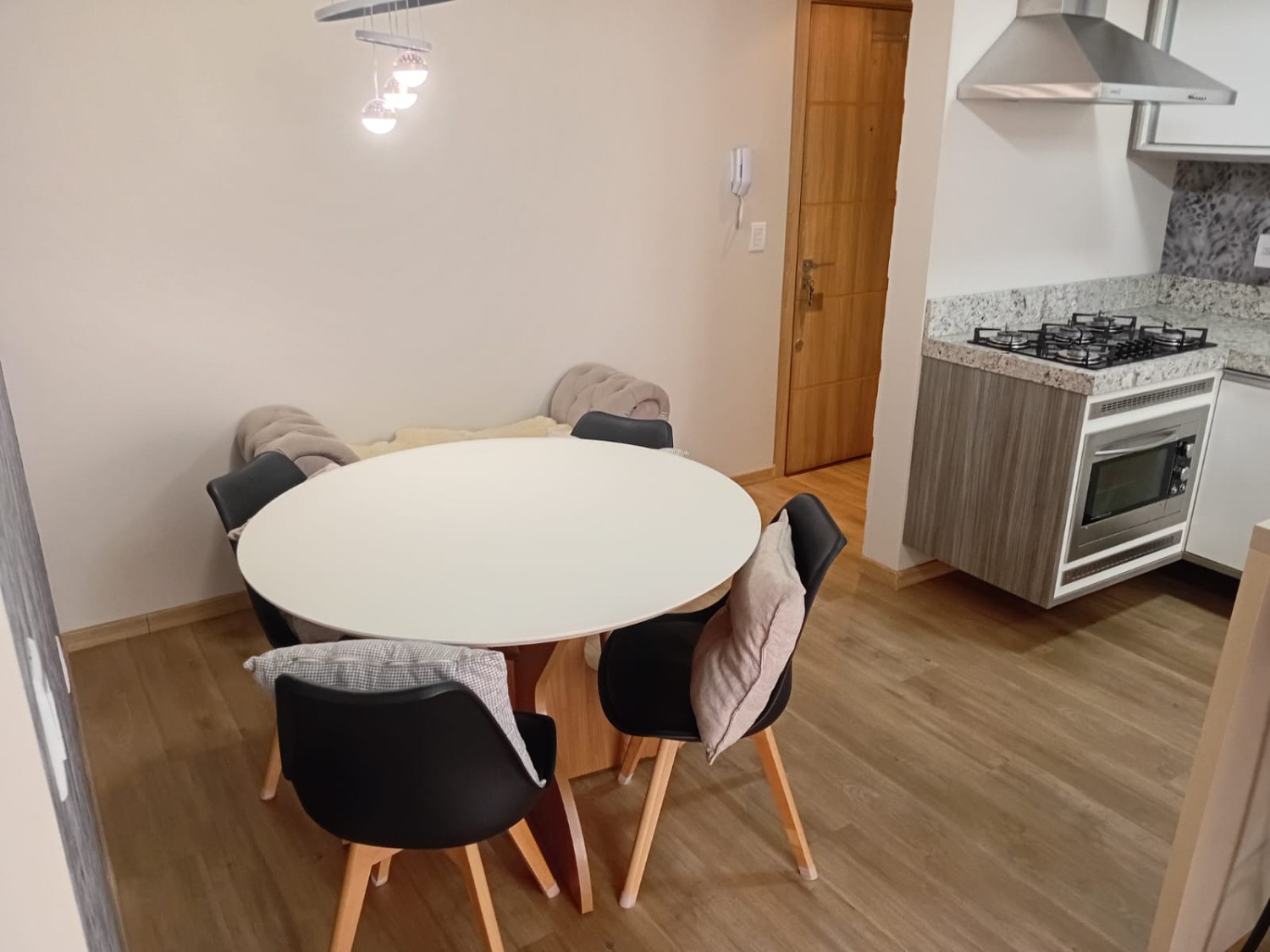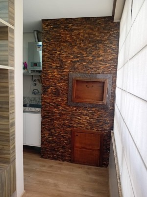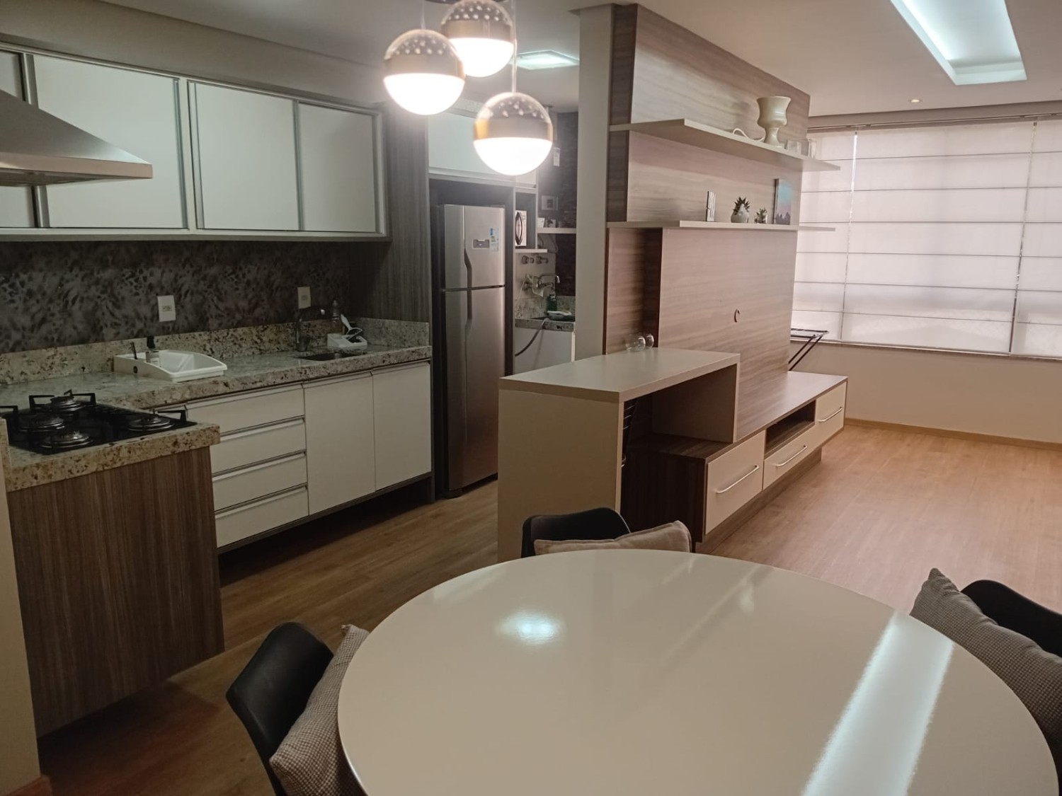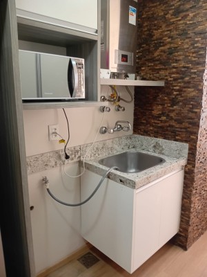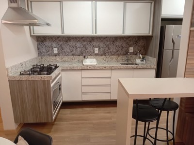 Descrição › Apartamento mobiliado com 02 dormitórios sendo um suite, sala estar e jantar com sacada integrada, cozinha, área de serviço, churrasqueira, uma vaga de garagem.