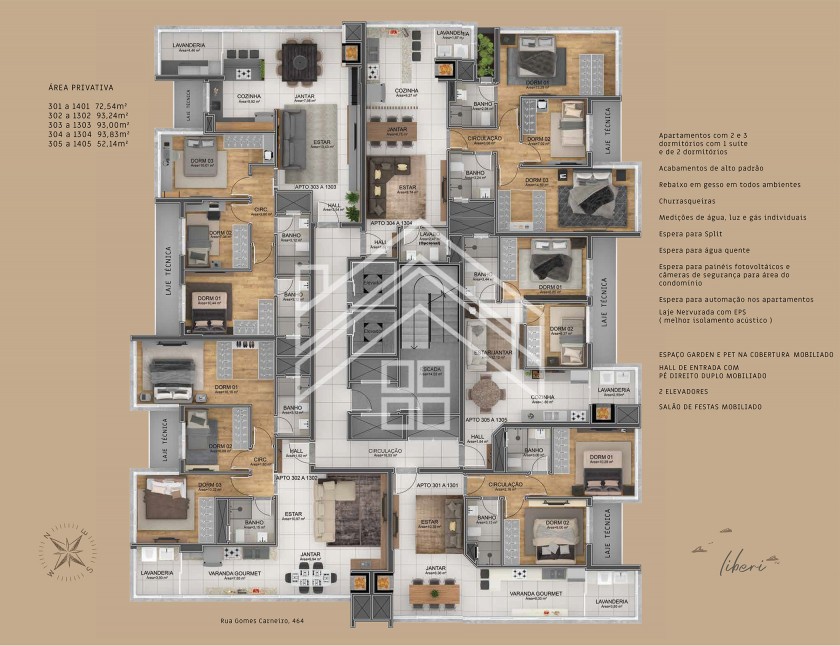 Hall de Entrada Decorado, Jardim, Rooftop, Salão de festas mobiliado, Terraço, Acessibilidade para Cadeirantes, Caixa d'Agua, Energia Fotovoltaica, Espera para Água Quente, Gás Central, espera para Ar-Condicionado Split, Infraestrutura para Automação, Lixeiras, Manta Acústica entre os Pavimentos, Medidores individuais de Água, gás e energia elétrica, Piso Laminado, Piso Porcelanato, Rebaixo em Gesso, Revestimento externo com detalhes em pastilha.