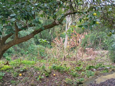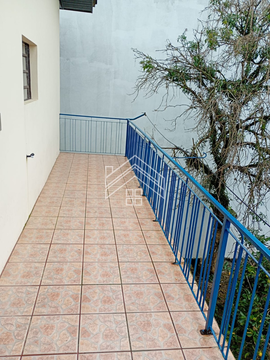 Patio nos fundos com alguns pés de fruteiras, e na frente calçada.