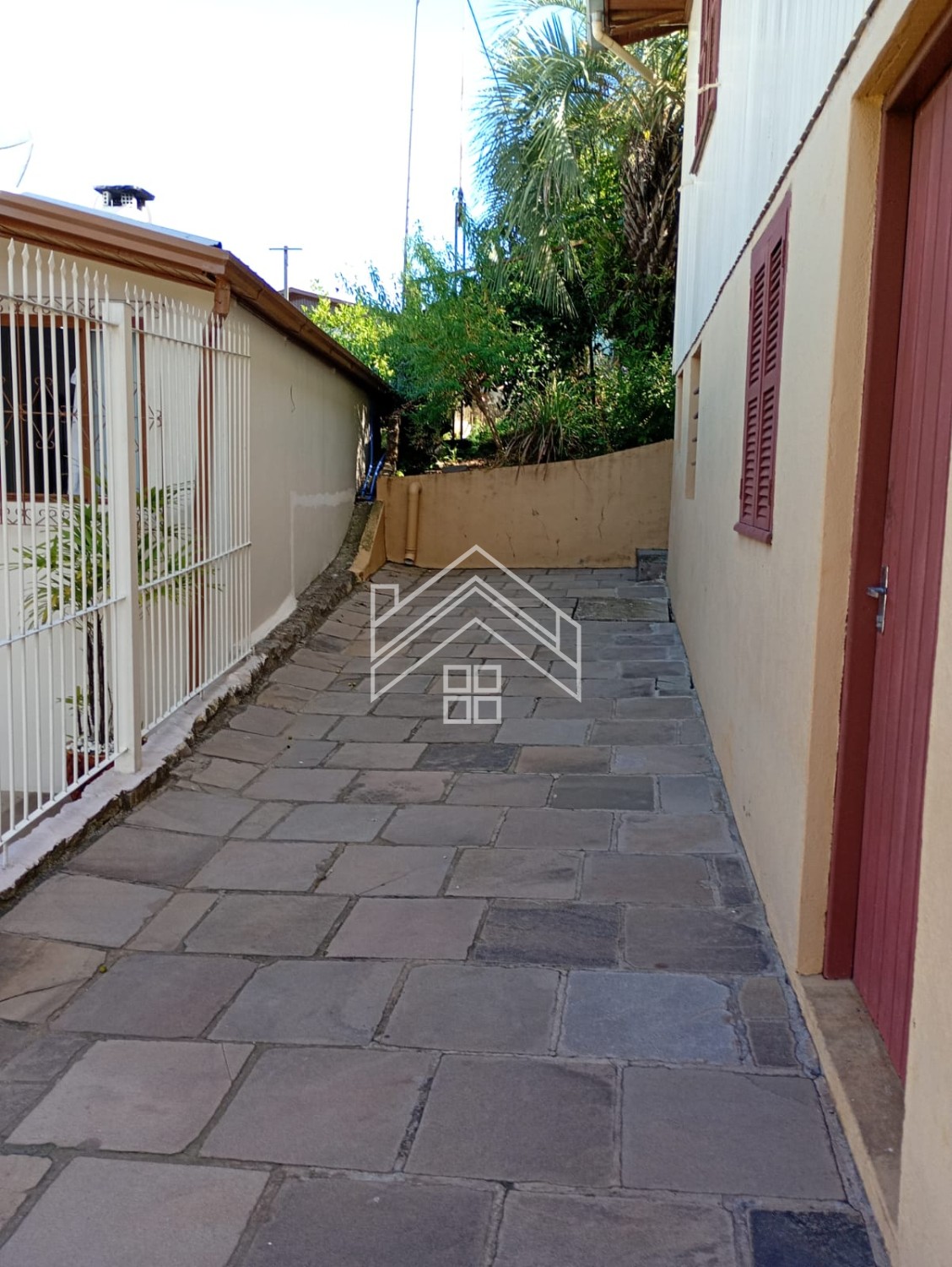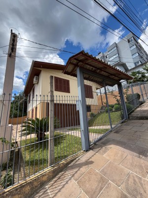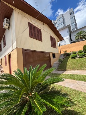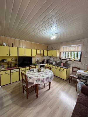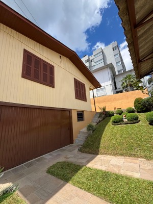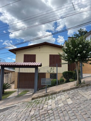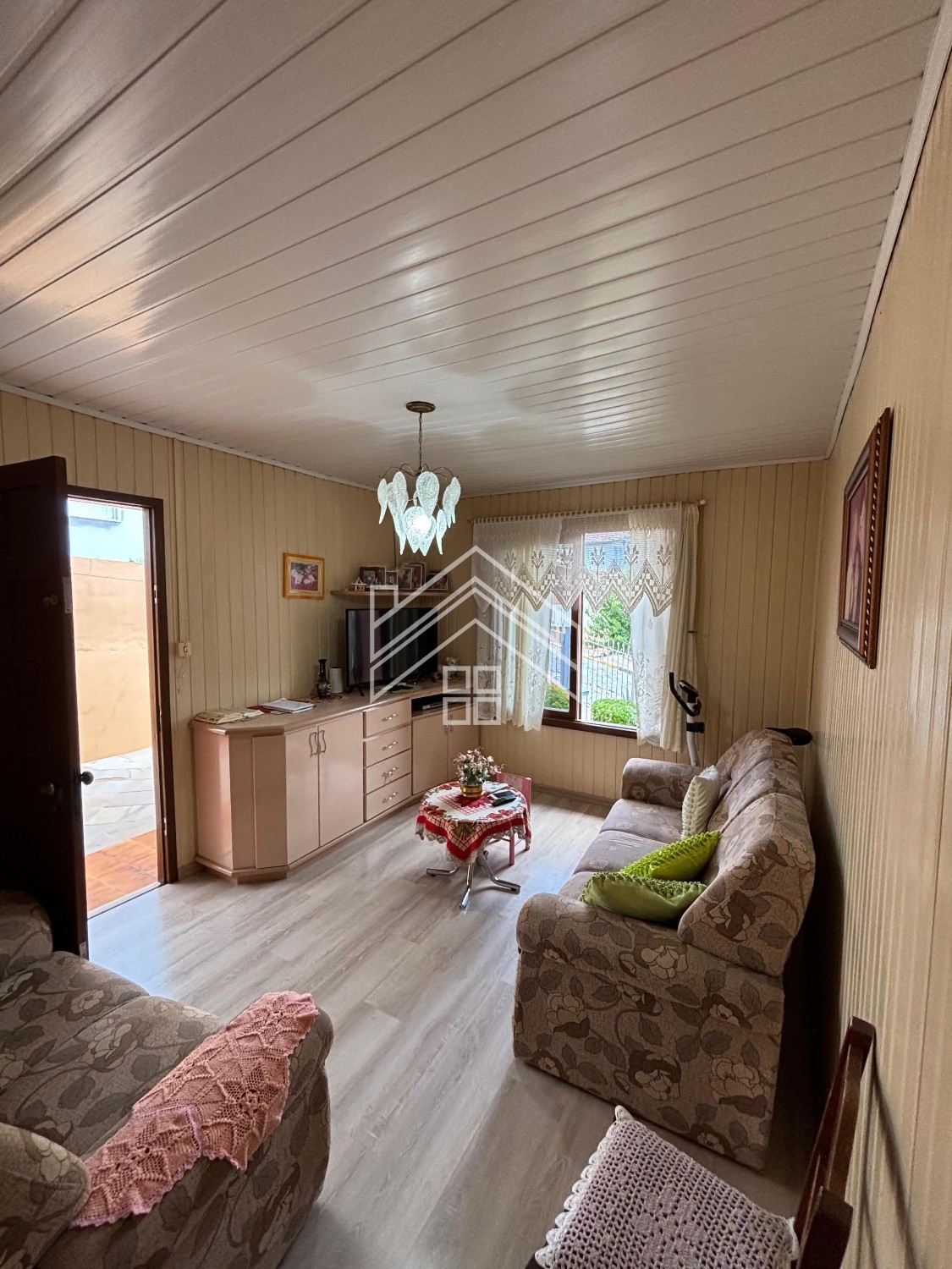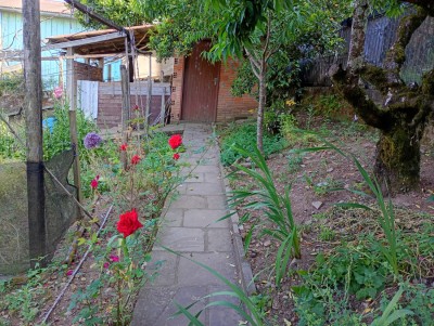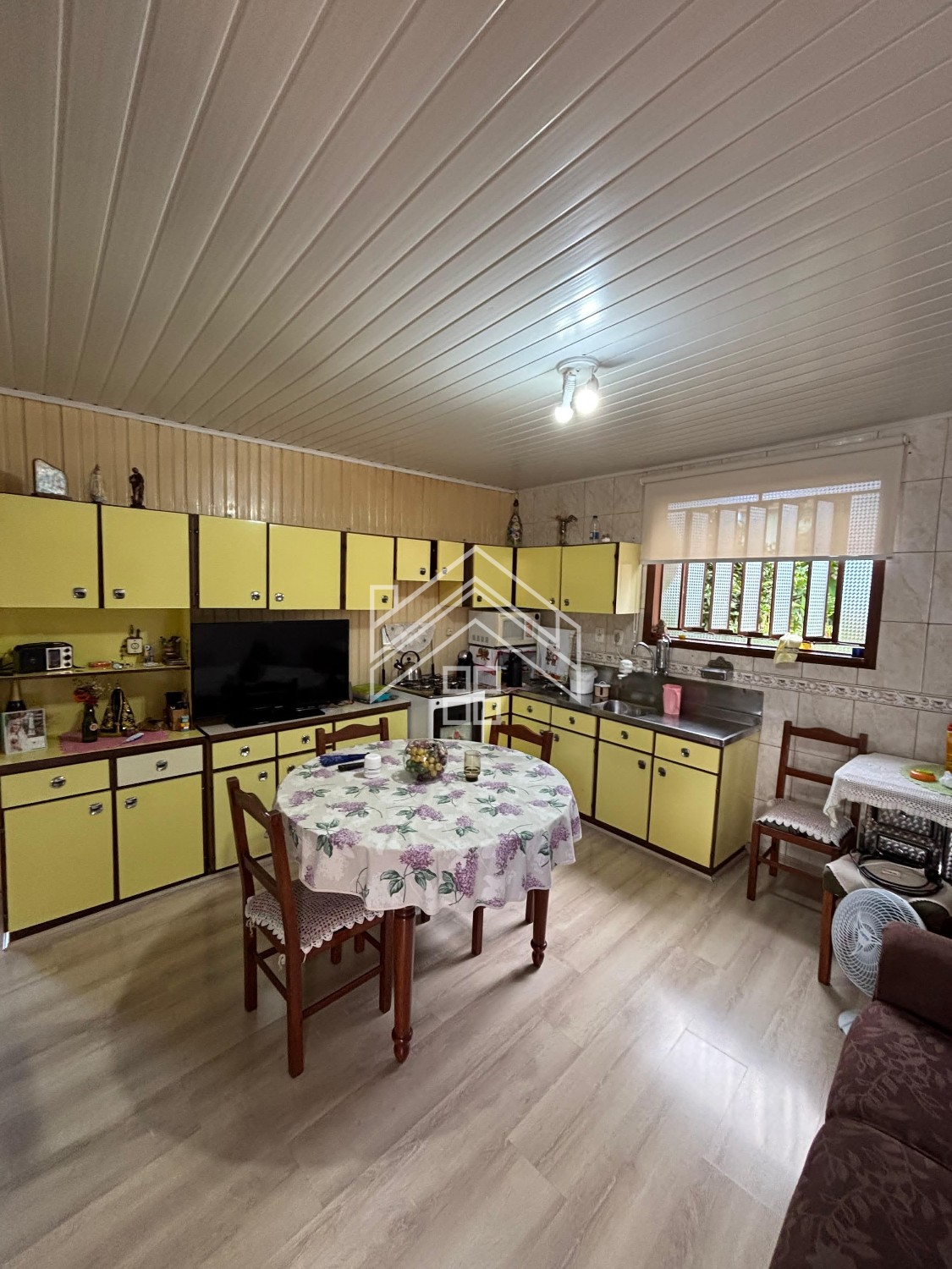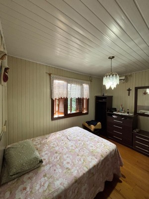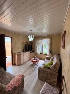 Descrição › Casa mista de 02 pisos, semi mobiliada, 03 dormitórios, sala estar, cozinha, 02 banheiro, área de serviço, porão, garagem fechada para 02 veículos, mais estacionamento, patio, horta, arvores frutíferas.