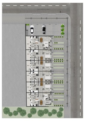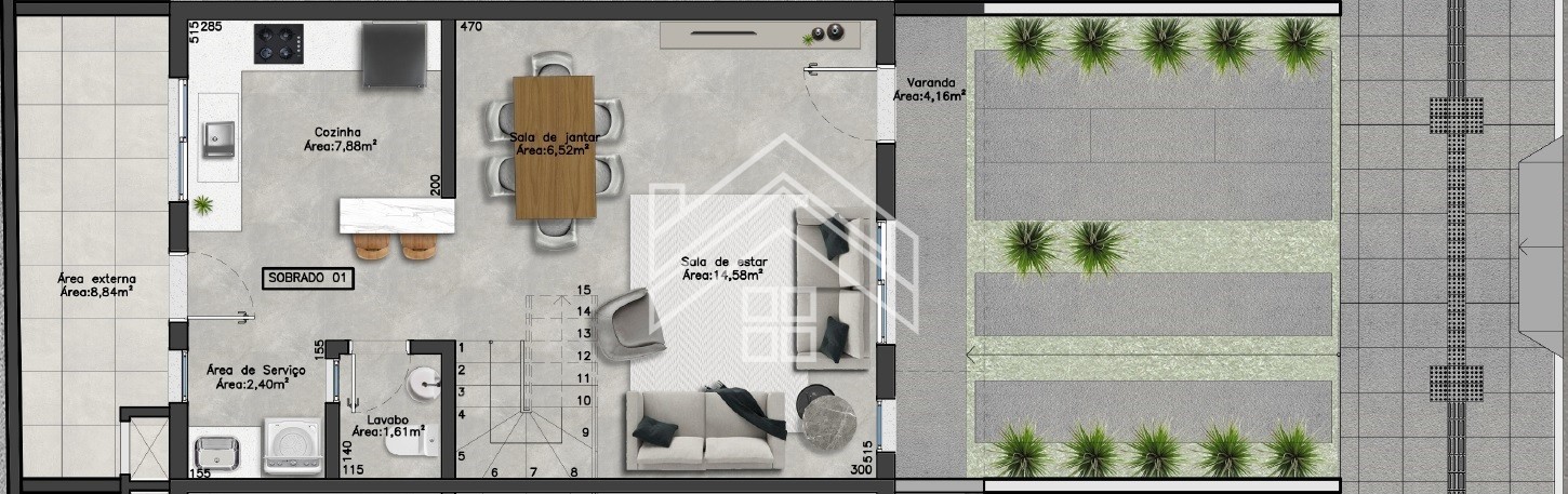 Descrição › Sobrado em fase de acabamento. Possui 02 dormitórios sendo um com sacada aberta, uma banheiro, sala estar e jantar , 01 lavabo, cozinha, área de serviço, espaço externo com churrasqueira, e vaga de estacionamento.