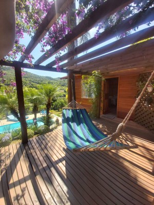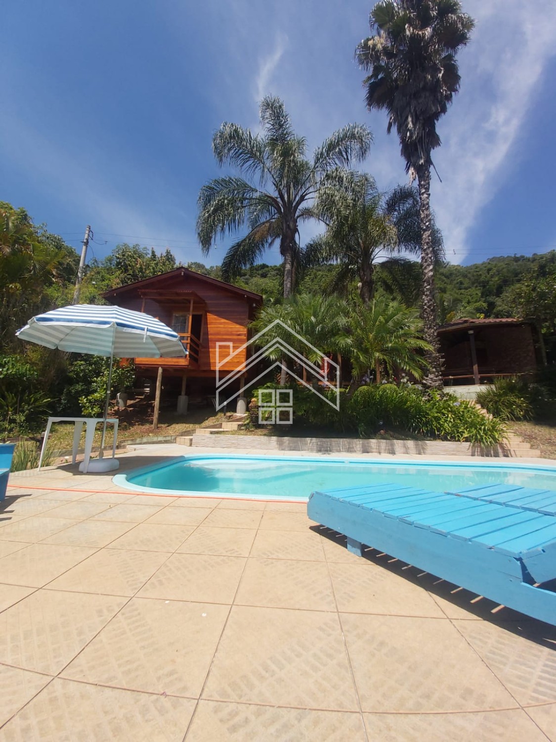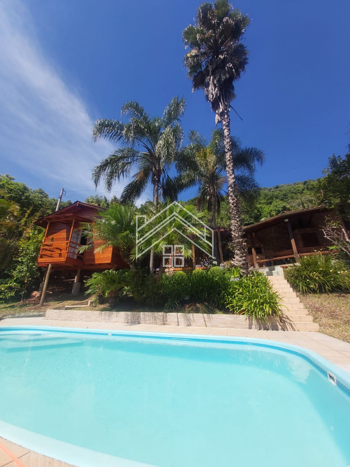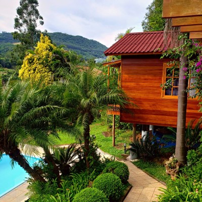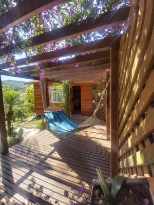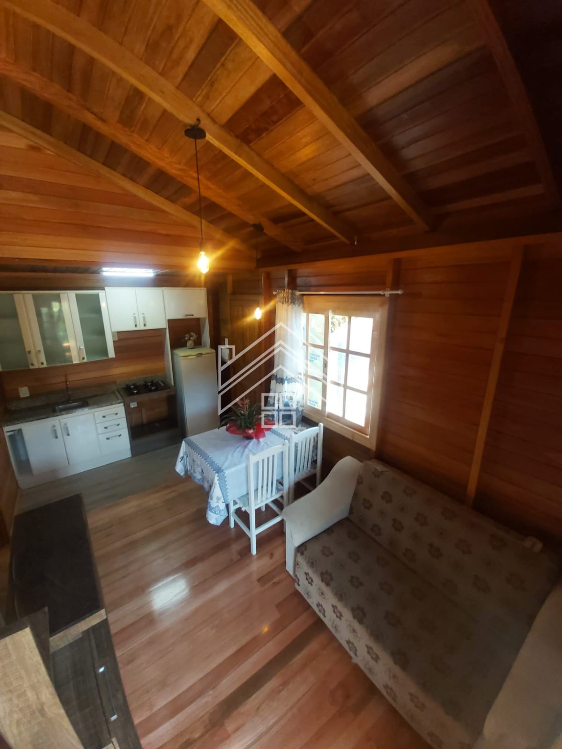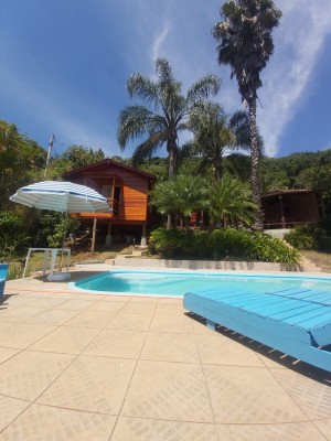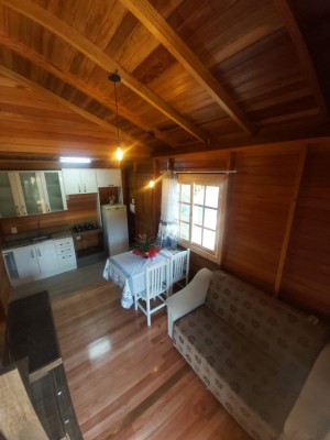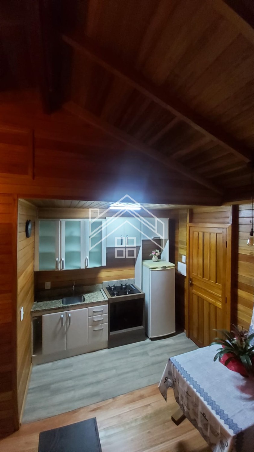 Cabana 25m² com 01 quarto, cozinha, 01 banheiro, lareira e varanda.